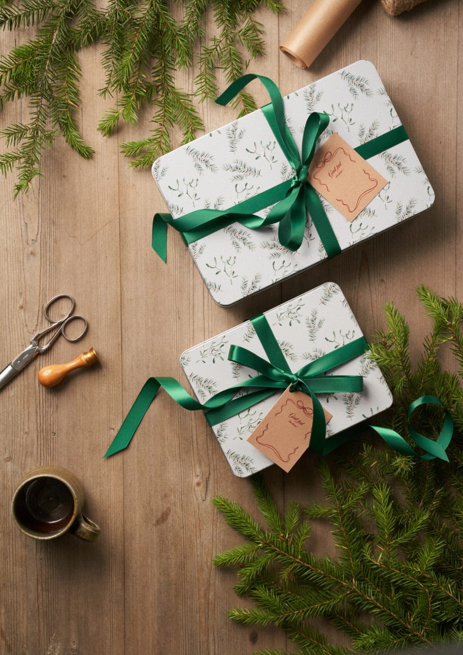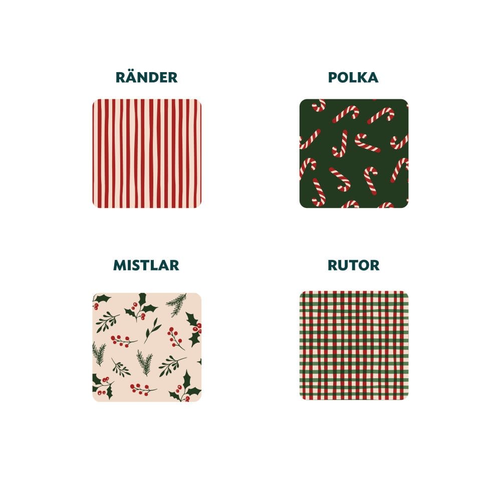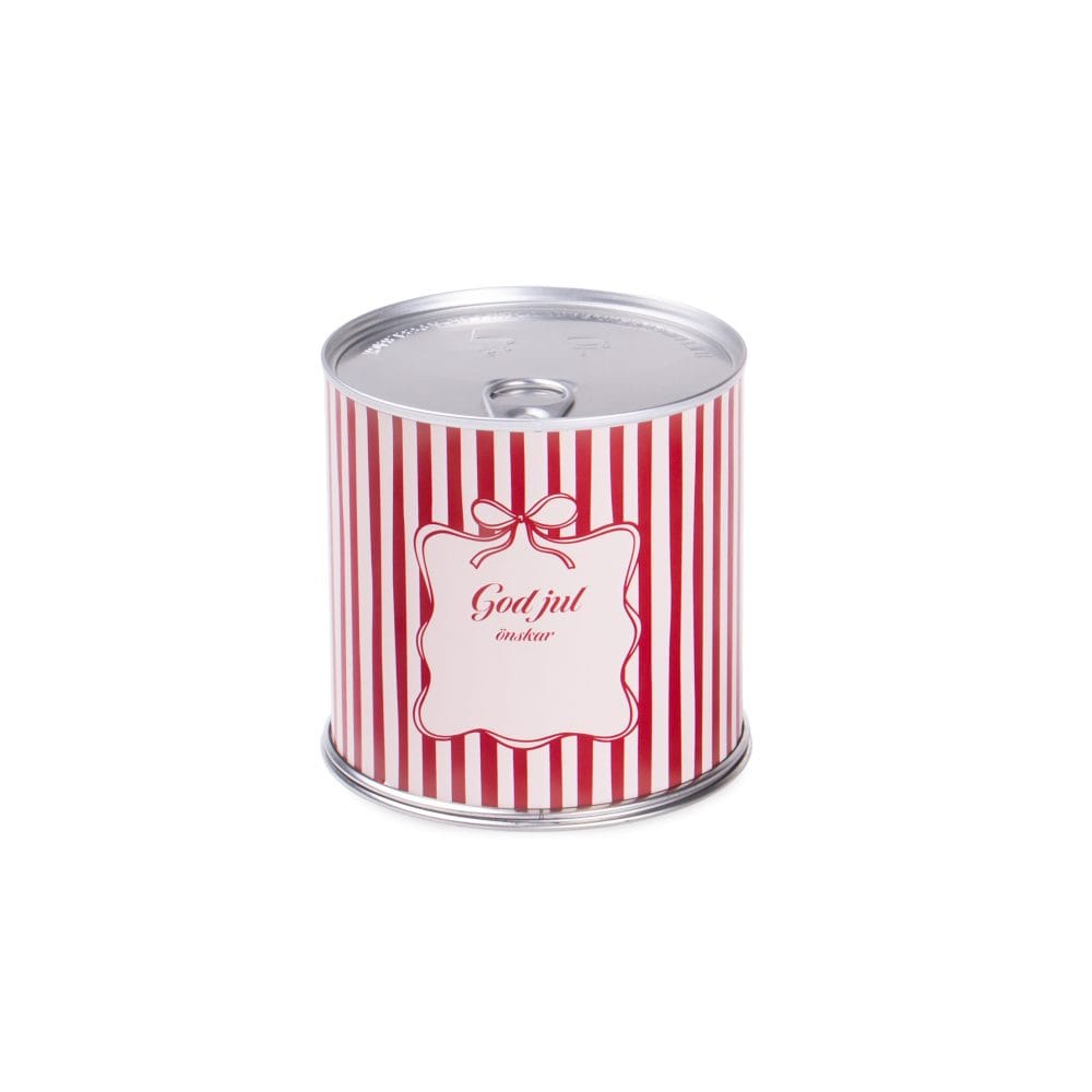 Plåtburk fylld med gott julgodis, välj mellan vår favoritmix, mjölkchokladpraliner, skumtomtar eller kolamix i smaker som hör julen till. Burken förses med en digitaltryckt banderoll. Välj något av våra fyra olika julmotiv: Mistlar, Ränder, Rutor eller Polka, så trycker vi er logotyp med det motiv ni väljer. Det går givetvis även att få helt egen design om så önskas.