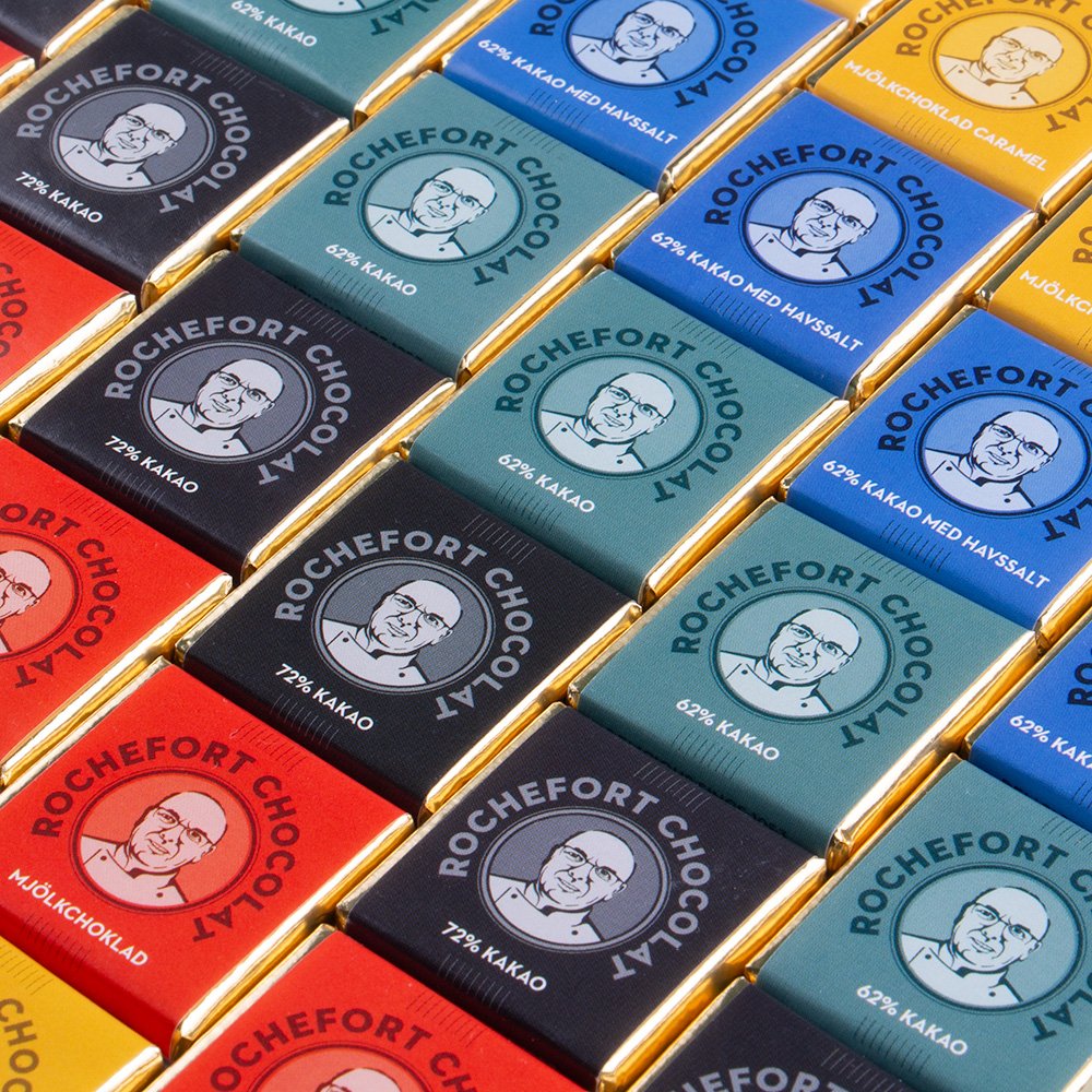 Smaker: Mjölkchoklad 42% kakao, mjölkchoklad salted caramel, mörk choklad 62% kakao, mörk choklad 62% kakao med havssalt samt mörk choklad 72% kakao.