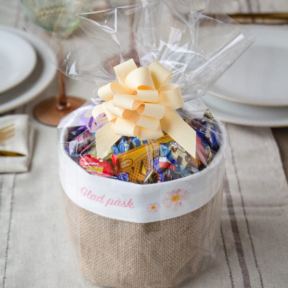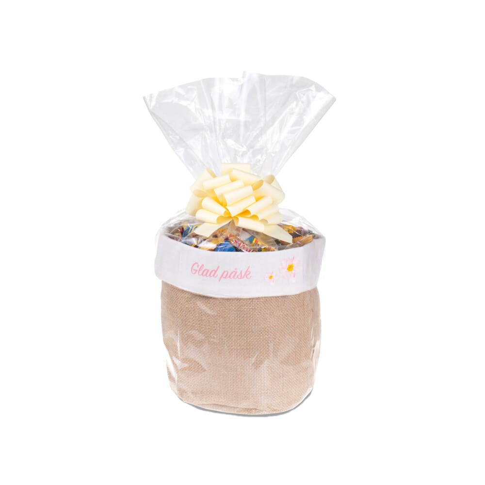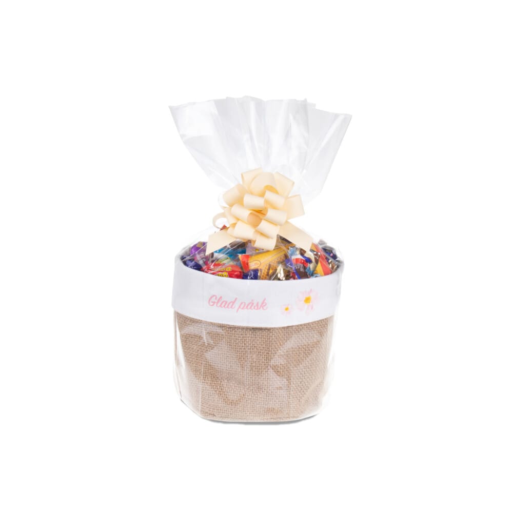 Stiliga korgar i naturfärgad jute – en elegant och personlig påskgåva. Våra korgar i naturfärgad jute är både stiliga och mångsidiga. De levereras utan tryck, men kan enkelt anpassas med ett valfritt motiv på den eleganta vita linnekanten, vilket gör varje korg unik. Fyllda till bredden med godis från välkända och omtyckta varumärken, blir detta en både smakfull och uppskattad gåva. Korgen levereras vackert inslagen i cellofan och pryds med en gul rosett. För att ge gåvan en extra personlig touch kan du lägga till ett kort med en hälsning.