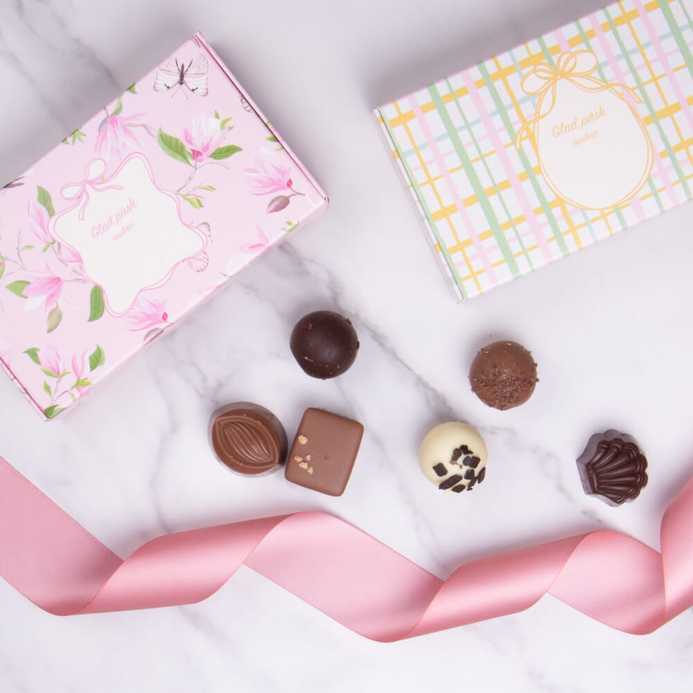 En elegant pralinask fylld med noggrant utvalda chokladpraliner av hög kvalitet. Den stilfulla designen gör asken till en perfekt gåva till påsk – lika fin att ge bort som att njuta av tillsammans. En smakfull kombination av lyx och njutning som garanterat uppskattas.