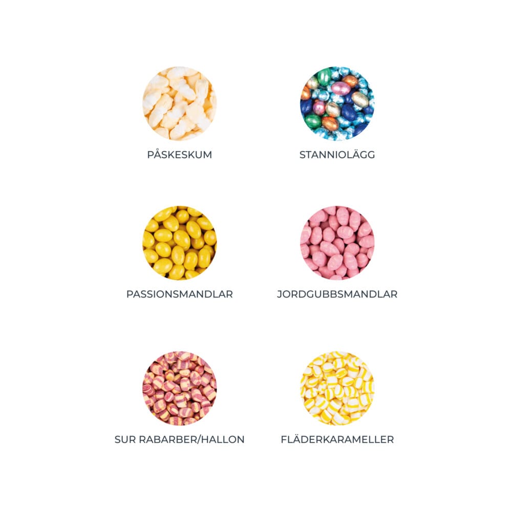 Innehåll: Jordgubbsmandel, Passionsmandel, Stanniolägg, Sur Rabarber/Hallon, Fläderkarameller